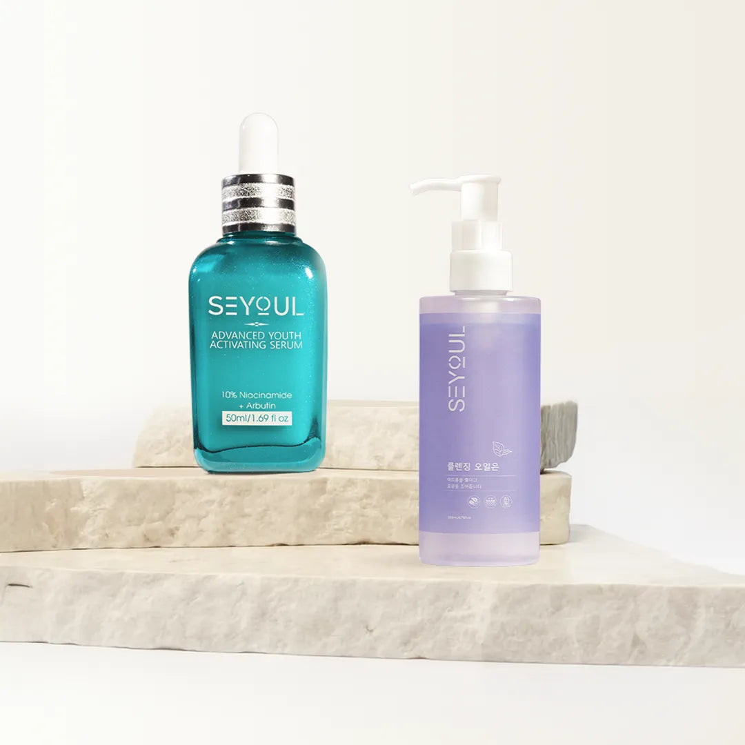 El combo perfecto para una piel limpia, luminosa y sin manchas — Una rutina completa que combina el poder del Aceite Limpiador para eliminar impurezas durante el día y el Sérum Activador Rejuvenecedor para regenerar la piel durante la noche